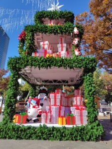 駅前のロータリーでは、一つのベンチにクリスマスの飾りつけがされていて、