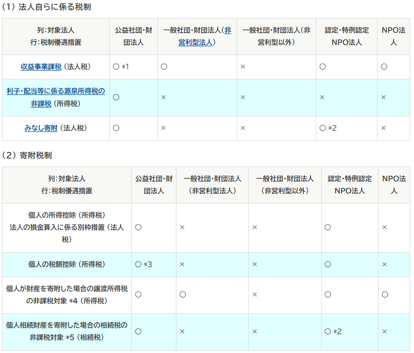 (出典:内閣府「公益法人制度とNPO法人制度の税制上の優遇措置の比較について」)