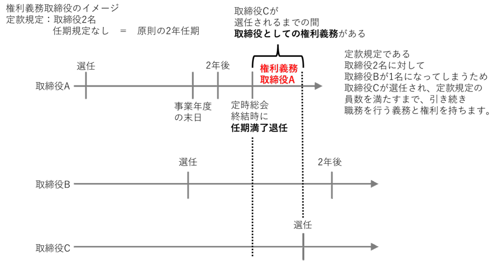 任期満了や辞任により本来は退任した役員が、 後任が決まるまでの間、職務を継続する場合をいいます。