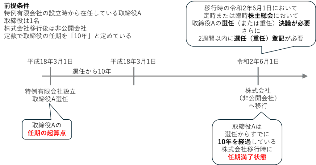 すでに10年を経過している場合、 株式会社移行時点で任期満了となり、 株主総会での選任(または重任)と役員変更登記が必要になります。
